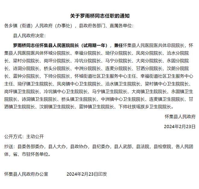 近日,广东怀集县发布县医院院长任命通知,任命罗雨桥为怀集县人民医院院长(试用期一年),并兼任县域医共体内其余39家医院院长,引发网友热议。