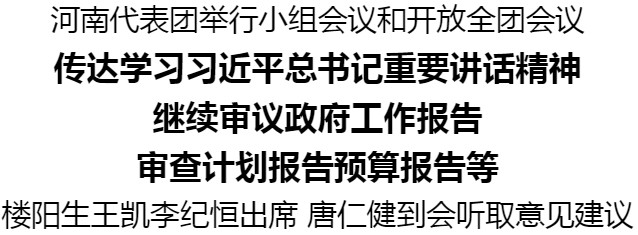 3月7日,河南代表团举行小组会议、开放全团会议,传达学习习近平总书记在参加江苏代表团审议、看望参加政协会议的民革科技界环境资源界委员时的重要讲话精神,继续审议政府工作报告,审查计划报告和预算报告,审议国务院组织法修订草案。河南代表团团长楼阳生、河南代表团副团长王凯、十四届全国人大农业与农村委员会副主任委员李纪恒出席。农业农村部部长唐仁健等到会听取意见建议。