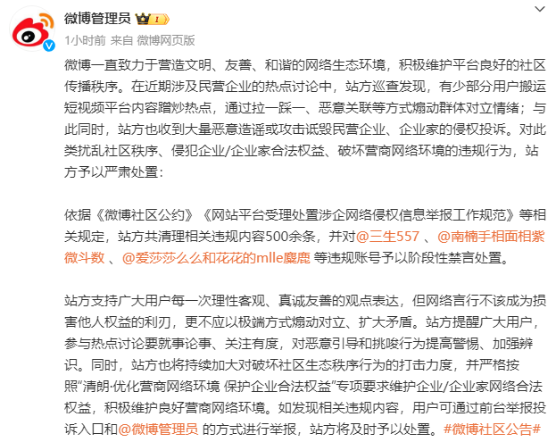3月8日,@微博管理员 发布表明称,在近期涉及民营企业的热点讨论中,站方巡查发现,有少部分用户搬运短视频平台内容蹭炒热点,通过拉一踩一、恶意关联等方式煽动群体对立情绪;与此同时,站方也收到大量恶意造谣或攻击诋毁民营企业、企业家的侵权投诉。对此类扰乱社区秩序、侵犯企业/企业家合法权益、破坏营商网络环境的违规行为,站方予以严肃处置。对违规账号予以阶段性禁言处置。