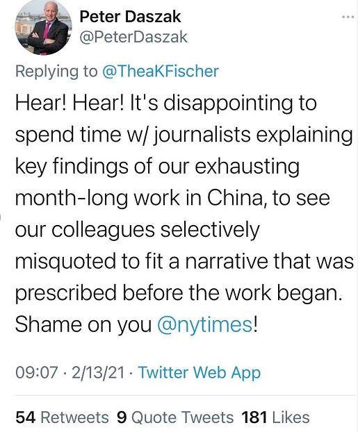 世界卫生组织麻疹、风疹、流感和小儿麻痹症参考实验室负责人、公共卫生专家西娅·菲舍尔(Thea K Fischer)也在推特上发帖表示《纽约时报》的报道严重扭曲了她所说的话:“这也不是我在流行病学团队得到的经验。中国方面和国际流行病学团队建立了良好的关系,(我们)进行的热烈讨论也反应了(中国方面的)高度参与。我们说的话被严重扭曲,这为重要的科学工作带来了阴影。”