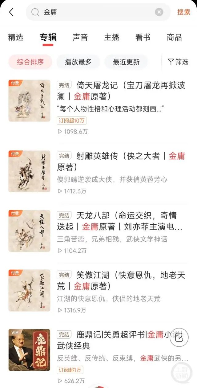 喜马拉雅APP四部金庸经典小说播放量均超1000万。网络截图