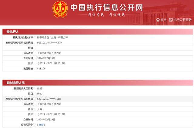 限消原因是,上海市嘉定区人民法院于2024年2月19日立案执行申请人周某某、裴某某、胡某、沈某某、陈某某、翟某申请执行钟薛高食品(上海)有限公司仲裁一案,因钟薛高食品(上海)有限公司未按执行通知书指定的期间履行生效法律文书确定的给付义务,法院根据相关规定,对钟薛高食品(上海)有限公司采取限制消费措施,限制钟薛高食品(上海)有限公司及钟薛高食品(上海)有限公司法定代表人林盛不得实施若干高消费及非生活和工作必需的消费行为。