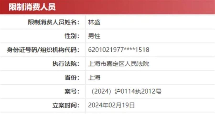 钟薛高法定代表人林盛被限制高消费(图源:中国执行信息公开网截图)