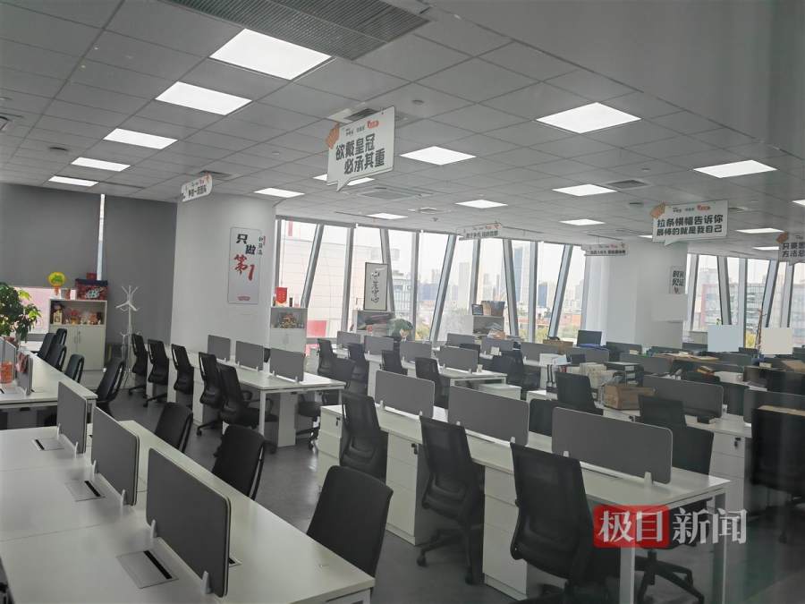 记者来到三楼的钟薛高总部看到,办公区仍有少数工作人员刷卡进出。约占整层办公楼四分之一面积的一块办公区内,整齐摆放着一排排桌椅,桌子上也摆放着办公电脑,墙上还挂有“钟薛高,只做第一”的标语牌,有的桌面上有几个纸箱子,里面装着办公用品。