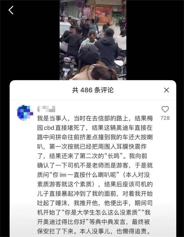 一名自称涉事学生的男子称,“奥迪车直接在路中间拼命往前挤,差点撞到我的车还大按喇叭。第一次按就已经把周围人耳膜快震炸了,结果还来了第二次的‘长鸣’。我向前确认了一下,司机不是老师而是游客,于是就质问对方”,而后,后座的年轻男子冲到他面前,“他对着我吐起了唾沫,我推开他,他便出手……”