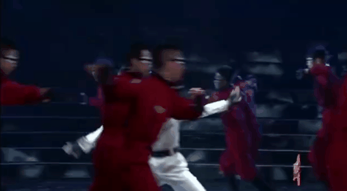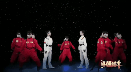 节目一开始,两位主演身着航天服与一群身穿红色衣服的表演者,在星河陨石中,起手舞太极。