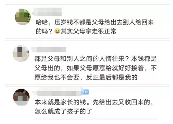 另有网友表示,压岁钱都是父母和亲戚朋友的人情往来,拿走很正常。