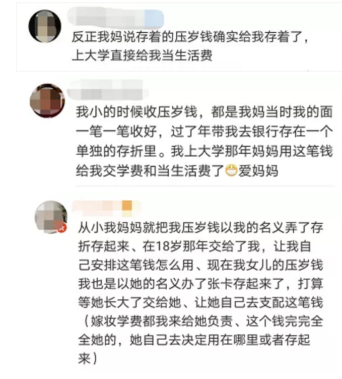 还有一些网友表示,妈妈虽然把自己的压岁钱收走了,但是会帮忙存起来,用于将来的学费和生活费。