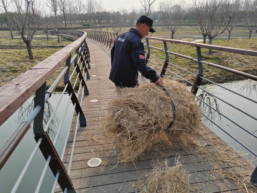 为了保障天鹅们有充足的“建筑材料”,工作人员和志愿者及时为每一对正在筑巢的天鹅补充干草。当日,记者就跟随王建亭从金融岛附近拉回一满车干草,然后给一家家天鹅送去,放在它们的巢附近。雌性天鹅在孵蛋期间几乎不进食,但在产卵期间会大量进食,工作人员和志愿者每天密切关注每一只天鹅的状态,及时对天鹅进行科学合理投喂。