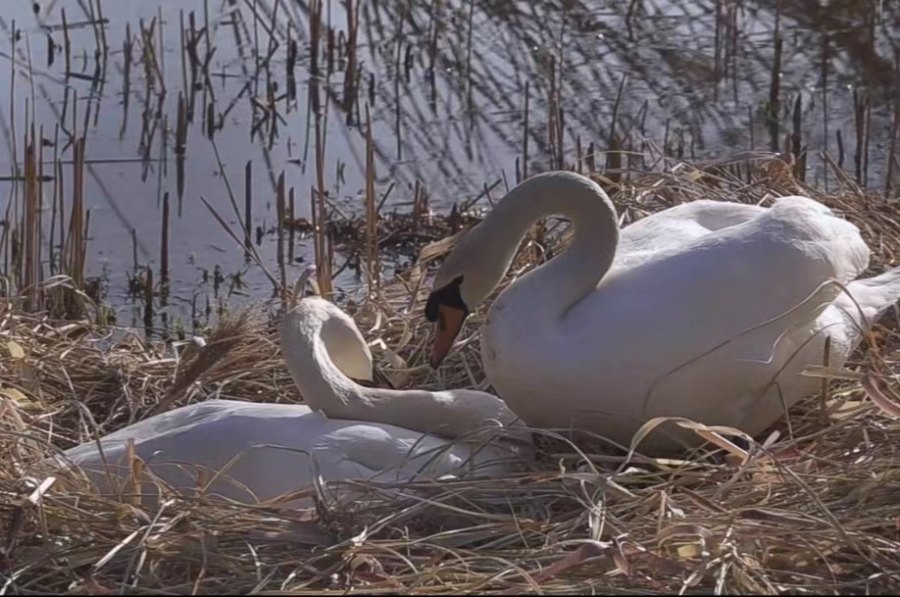 “目前在北龙湖区域做窝的天鹅有10对,其中有7对已经产蛋。”北龙湖保安工作人员王建亭介绍说,疣鼻天鹅开始产蛋后,每1到2天产一枚蛋,待所有蛋产完,它们开始孵蛋,孵化期35天左右。孵化期间,雌性天鹅负责孵蛋,雄性天鹅负责在周围警戒守护,只有当雌性天鹅需要离巢喝水时,雄性天鹅才会短暂的替班孵蛋。