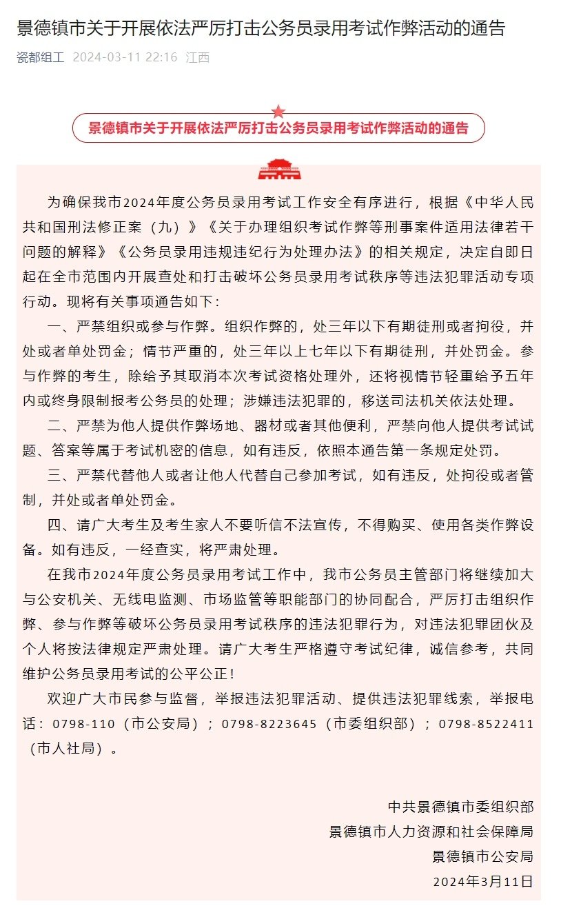 记者梳理发现,3月11日,景德镇市委组织部在微信公众号“瓷都组工”发布了《景德镇市关于开展依法严厉打击公务员录用考试作弊活动的通告》(以下简称《通告》)。《通告》称,“即日起在全市范围内开展查处和打击破坏公务员录用考试秩序等违法犯罪活动专项行动”;