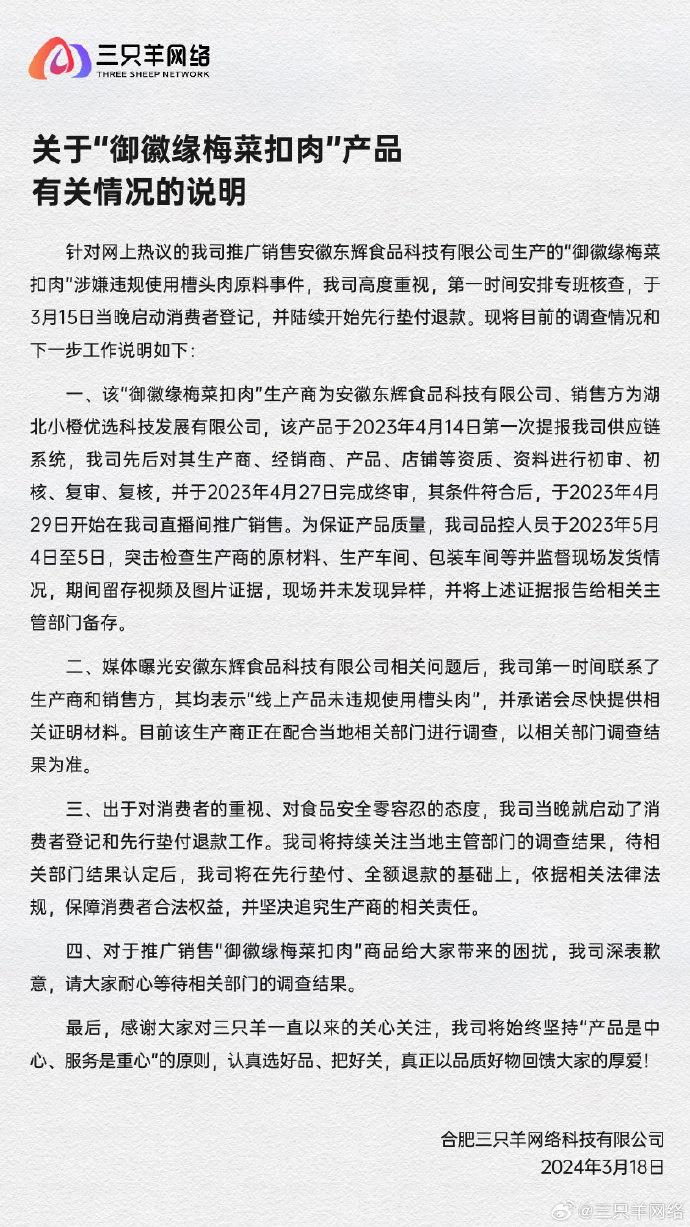 3月18日,@三只羊网络 发布关于“御徽缘梅菜扣肉”产品有关情况的说明:该“御徽缘梅菜扣肉"生产商为安徽东辉食品科技有限公司、销售方为湖北小橙优选科技发展有限公司,该产品于2023年4月14日第一次提报我司供应链系统,我司先后对其生产商、经销商、产品、店铺等资质、资料进行初审,初核、复审、复核,并于2023年4月27日完成终审,其条件符合后,于2023年4月29日开始在我司直播间推广销售。