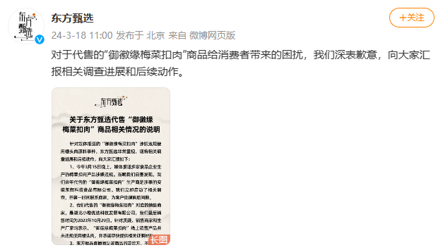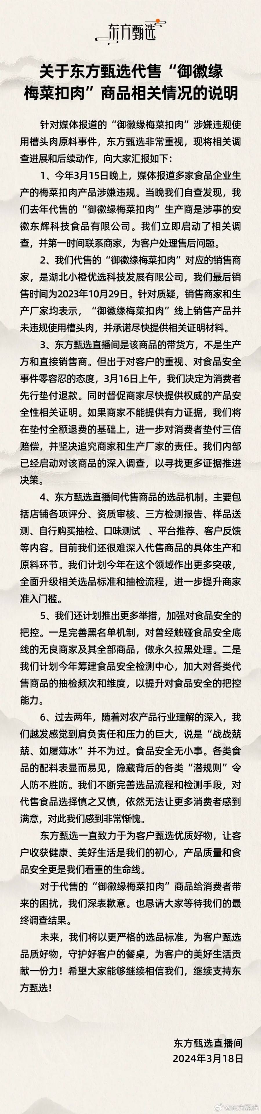 3月18日,@东方甄选 发布情况说明,对于代售的“御徽缘梅菜扣肉”商品给消费者带来的困扰表示歉意,并向大家汇报相关调查进展和后续动作。