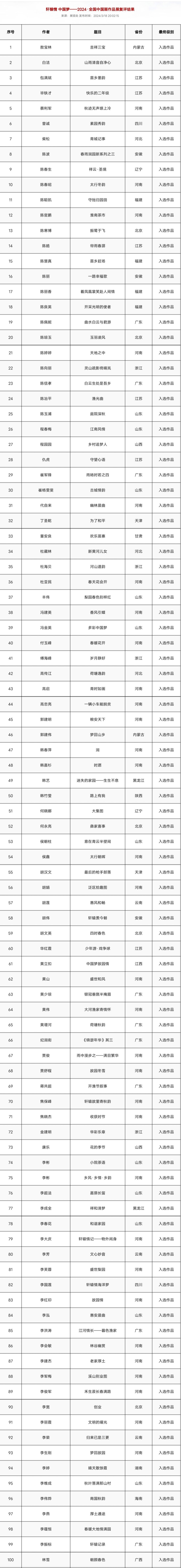 “轩辕情 中国梦——2024•全国中国画作品展”复评结果已在中国美术家协会官网公布,参与作者可前往查询。同时,这257件作品将于4月11日举办黄帝故里拜祖大典之际在郑州美术馆展出。