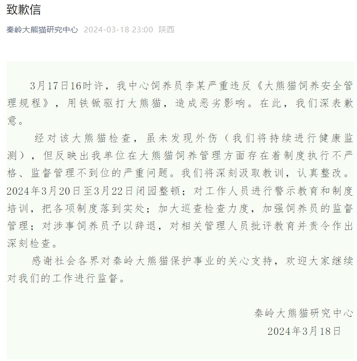 3月18日晚,秦岭大熊猫研究中心发布致歉信称,3月17日16时许,该中心饲养员李某严重违反《大熊猫饲养安全管理规程》,用铁锨驱打大熊猫,造成恶劣影响。在此,秦岭大熊猫研究中心深表歉意。