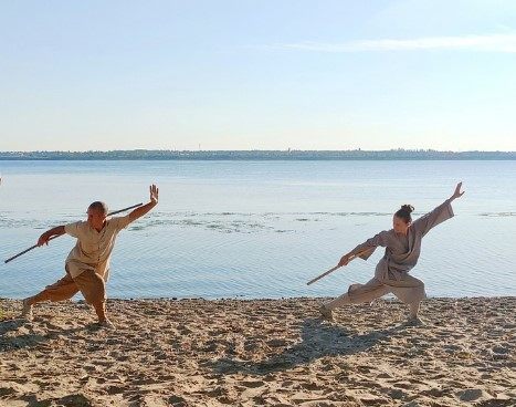 圣彼得堡少林文化中心负责人释延夫、释延滨夫妇在伏尔加河岸边练习少林功夫