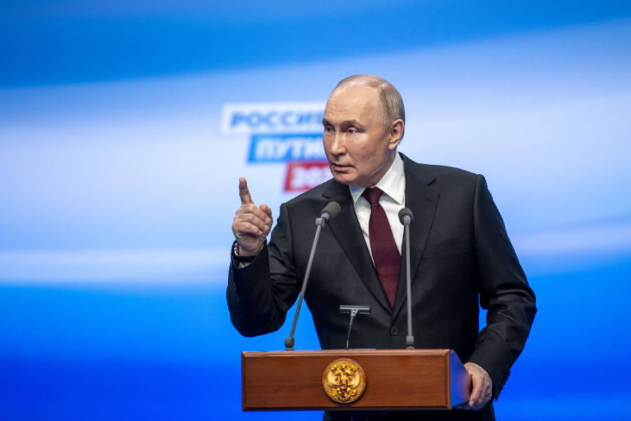 2024年3月18日,普京在俄罗斯首都莫斯科的竞选总部回答记者提问。