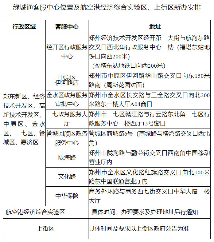 1.郑东新区、经济技术开发区、高新技术开发区、中原区、金水区、二七区、管城区、惠济区符合条件的老年人,可持有效证件到绿城通各客服中心动态办理。