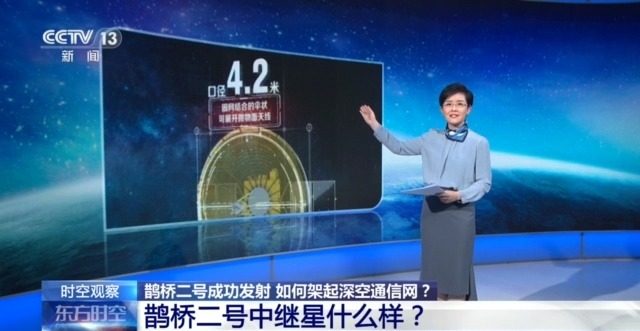 要说鹊桥二号最引人注目的,应该就是这个金色的“大伞”了。它的口径达到了4.2米,伞面由镀金钼丝织成,主要用于反射电磁波。