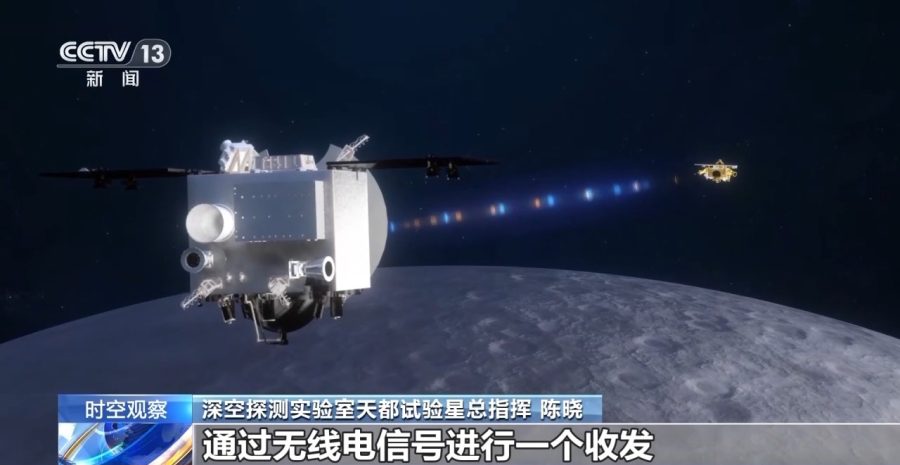 深空探测实验室天都试验星总指挥 陈晓:这个卫星主要是开展月球通信导航技术验证,两颗卫星之间通过无线电信号进行一个收发,来测量两颗卫星之间的距离。我们现在地球的通信导航卫星是比较多的,面向月球空间的,还有一些技术难度,我们要开展这些技术的先行验证。
