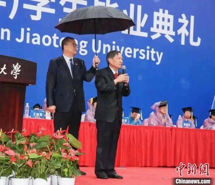西安交通大学毕业典礼当日,该校党委书记卢建军为校长王树国撑伞。西安交通大学供图