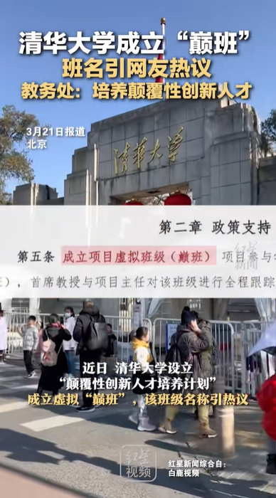 近日,清华大学成立虚拟“巅班”,因班级名称特别,登上多个平台热搜。对此,清华大学教务处工作人员回应,学校确实有这样的育人项目,项目名称是“颠覆性创新人才培养项目”,所以班级名叫“巅班”。