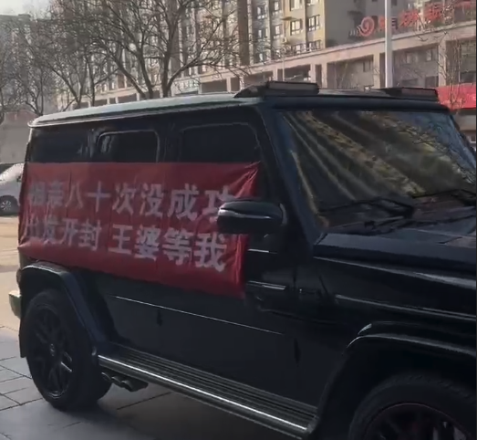 随着开封王婆的爆火,最近,大量来自全国各省的男女青年,争先恐后赶往开封,有开豪车的,有骑摩托的,有开拖拉机的,还有直接开婚车的。有位云南小伙驾车前往开封,车上挂着条幅:“相亲八十次没成功,云南小伙出发开封,王婆等我。”