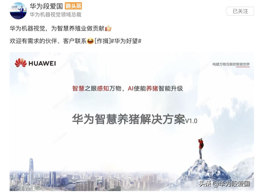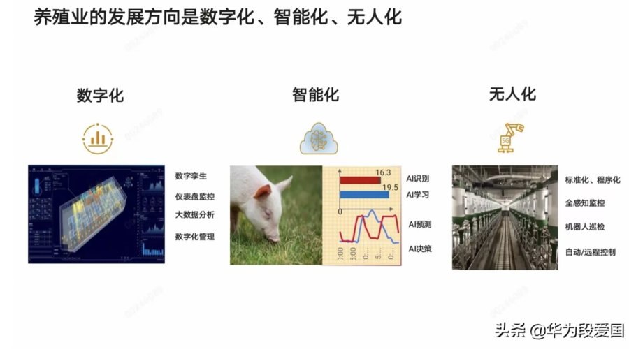 近日,华为机器视觉领域总裁段爱国在微头条爆料称,华为机器视觉推出了智慧养猪方案。养殖业的发展方向是数字化、智能化和无人化。