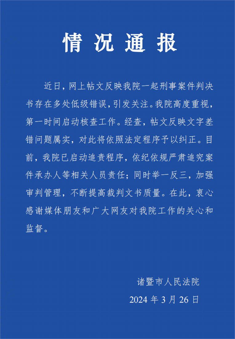 浙江诸暨法院通报判决书出现100多处错误:属实,已启动追责程序