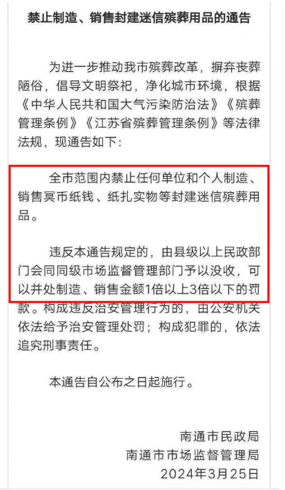 3月26日,江苏省南通市发布通告,要求全市范围内禁止任何单位和个人制造、销售冥币纸钱、纸扎实物等封建迷信殡葬用品,违规最高将被处3倍罚款。