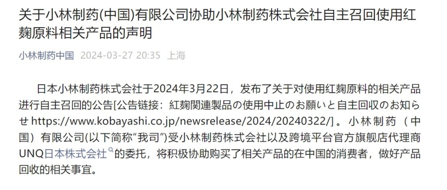 关于小林制药(中国)有限公司协助小林制药株式会社自主召回使用红麹原料相关产品的声明