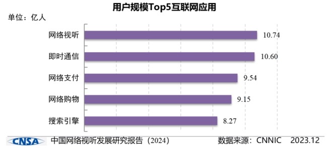 截至2023年12月,我国网络视听用户规模达10.74亿,网民使用率为98.3%。值得注意的是,网络视听用户规模与排在第二的即时通信之间的差距进一步拉大,领先优势从2022年的184万人提升到2023年的1414万人。