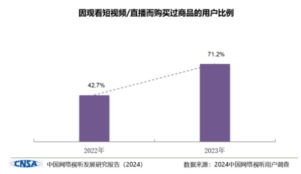 此外,短视频直播拉动消费效应明显,七成以上用户因看短视频/直播购买商品,短视频/直播和电商、文旅成为最强CP。“带货成直播C位。调查显示,53.7%的用户经常收看电商直播\直播带货,较2022年增加23.4个百分点,增速最快。”
