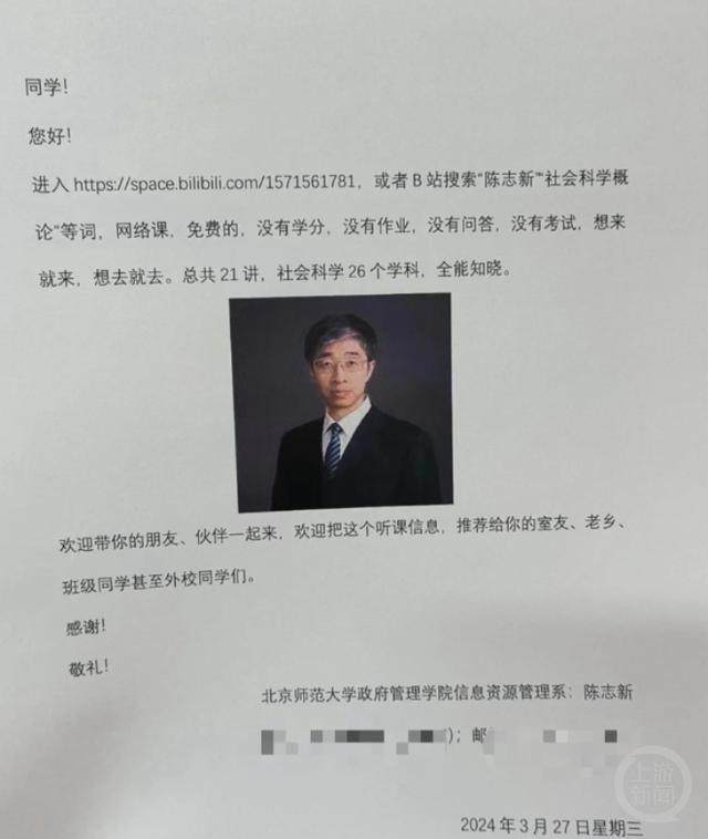 上游新闻记者看到,传单上有网课的搜索方式。“网络课、免费的、没有学分、没有作业、没有问答、没有考试、想来就来、想去就去。总共21讲,社会科学26个学科”“欢迎带你的朋友、伙伴一起来,欢迎把这个听课信息,推荐给你的室友、老乡、班级同学甚至校外同学们”,署名为“北京师范大学政府管理学院信息资源管理系陈志新”,还留有联系方式。