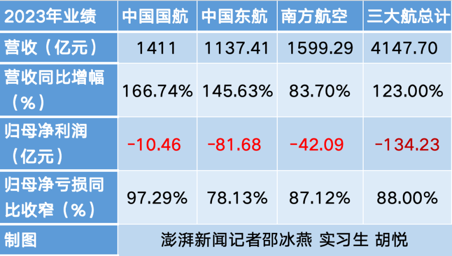 三大航归母净亏损总计134.23亿元,整体同比收窄近88%。其中,中国国航减亏幅度最大,达到97.29%,南方航空亏损收窄87.12%,中国东航亏损收窄78.13%。