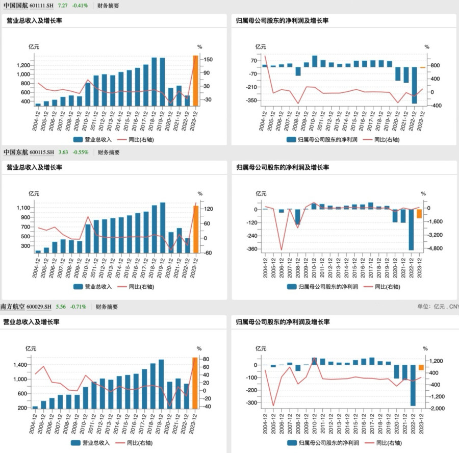 总体来看,三大航2023年业绩集体仍未实现扭亏,但整体经营业绩上有明显改善,营收均实现倍增恢复。去年前三季度业绩亮眼,多项数据创新很高,但去年第四季度属于传统民航客运淡季,其间不少航线价格都会环比大幅回落。具体来看航司业绩,南方航空去年营收最高,达到了1599.29亿元,国航其次,营收为1411亿元,东航营收为1137.41亿元,分别同比增长超八成、增超1.6倍、增超1.4倍。值得注意的是,其中国航和南航去年营收已创历史新高。