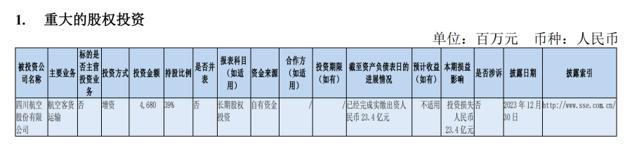 南方航空副董事长、总经理韩文胜在3月29日的业绩说明会上也提到,四川航空前期未确认的损失自2021年6月开始形成,截至2023年12月31日增资当期,确认亏损23.4亿元,尚未确认26.6亿元。投资损失产生的原因主要是疫情期间四川航空累计经营亏损,超出南航对四川航空的投资成本。