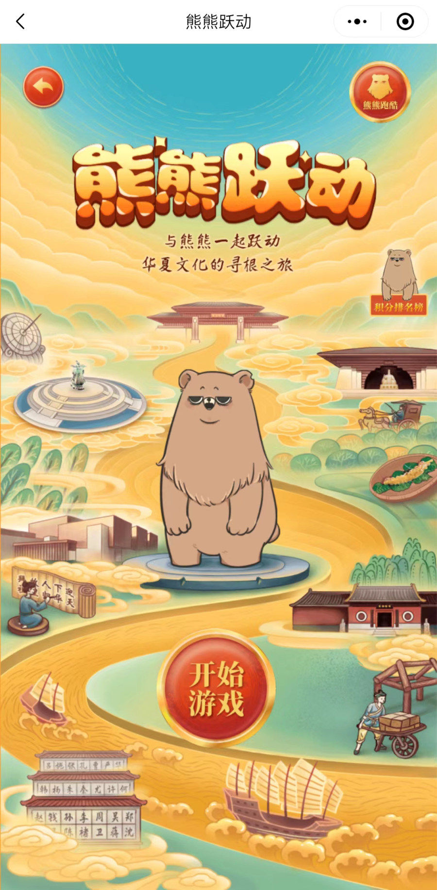 虽然“有熊”很忙,但它依然要在“云拜祖”平台与大家一起玩游戏。在名为“熊熊跃动”的游戏中,大家要控制“有熊”的跳跃力度和方向,使其跳到指定的站桩,然后就可以解锁黄帝故里的主要景点和黄帝文化的知识。