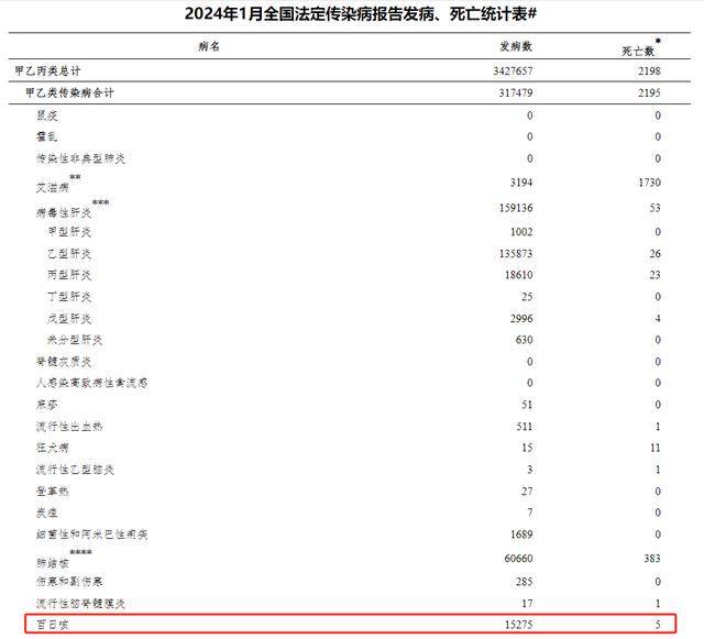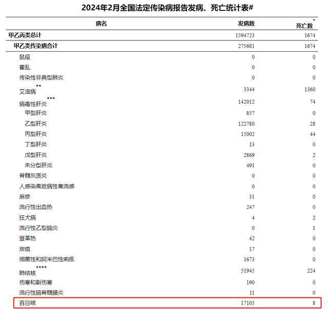 据国家疾控局官网定期发布的"全国法定传染病疫情概况",2024年1月1日-2月29日,全国报告百日咳32380例,是2023年同期(1421例)的近23倍。其中,1月死亡人数为5人,2月死亡人数为8人。