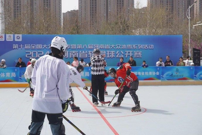 头戴“头盔”、身穿“铠甲”、脚踩“风火轮”……轮滑球小将们酷酷的装备让人眼前一亮,只见他们手持球杆,在场上灵活穿梭、配合默契,诠释出轮滑球运动的独特魅力。据了解,单排轮滑球作为冰球的衍生运动,是一项对抗性强、观赏性高的团体运动项目,其魅力在于运动员细腻精巧的接控传球技术,衔接巧妙的团体配合,速度极快的攻防转换和永不言弃的拼搏精神。所使用的场地、装备、规则、技术技巧都和冰球非常近似。正因如此,单排轮滑球作为类冰雪项目在我省这个内陆省份开展得亦是火爆。河南省于2018年开始推广轮滑球项目,并得到河南轮滑爱好者的大力追捧,目前中小学陆续在校园建设专业轮滑球场地数十块,高校参与度也逐年递增,赛事规模已从开始的几支队伍参加,发展到现在的30多支队伍参与其中。