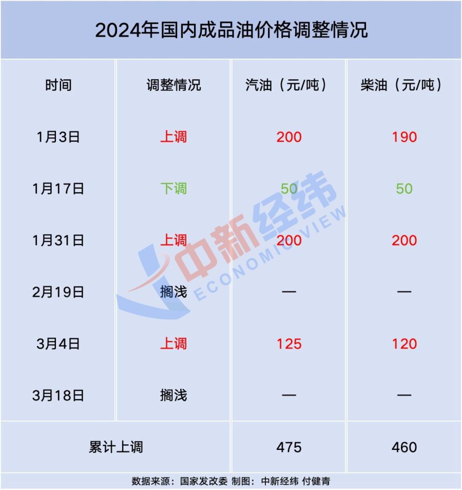记者梳理发现,年内国内油价已经历六轮调整,呈现“三涨一跌两搁浅”。国内汽、柴油价格每吨较去年底分别提高475元、460元。