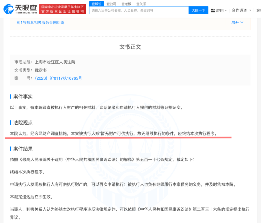 法院认定:郑爽暂无财产可供执行