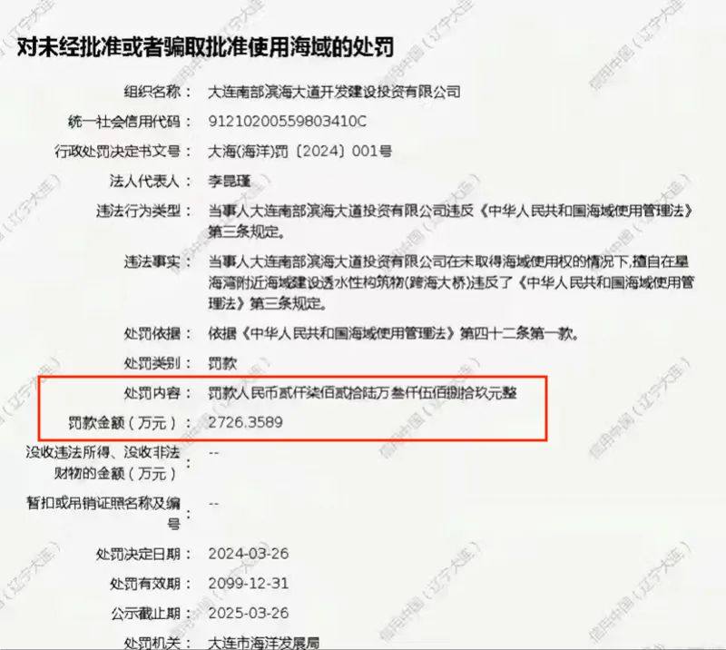 这就让人看不懂了,工程量巨大的跨海大桥,怎么还能“擅自建设”呢?大连市海洋发展局一工作人员解释了,该项目在获得预审批后动工建设,之后才获得海域使用权证。因建设程序违规,才被处以行政处罚。也就是说,先后顺序走错了,才被罚款。