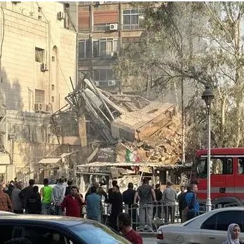 这是4月1日在叙利亚首都大马士革拍摄的空袭现场(手机拍摄)。叙利亚通讯社当日报道,以色列当天空袭伊朗驻叙利亚大使馆领事部门建筑。叙军方说,袭击造成大量人员伤亡。新华社发(胡马姆摄)