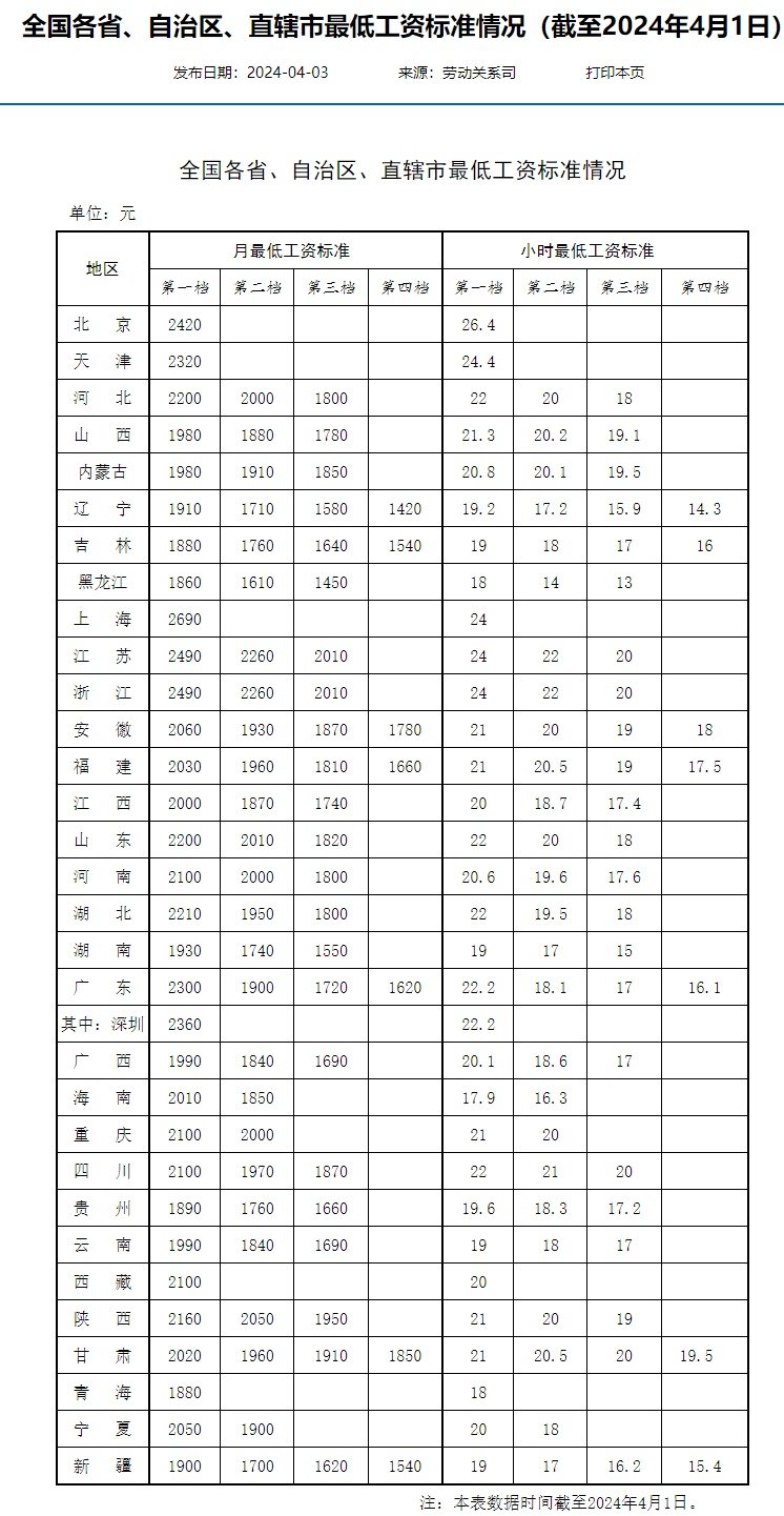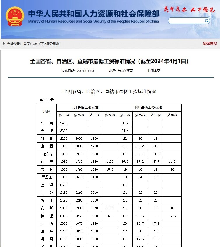 4月7日消息,人社部网站日前公布了全国各省、自治区、直辖市最低工资标准情况(截至2024年4月1日)。