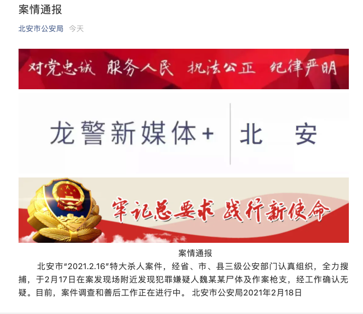 北安市“2021.2.16”特大杀人案件,经省、市、县三级公安部门认真组织,全力搜捕,于2月17日在案发现场附近发现犯罪嫌疑人魏某某尸体及作案枪支,经工作确认无疑。目前,案件调查和善后工作正在进行中。