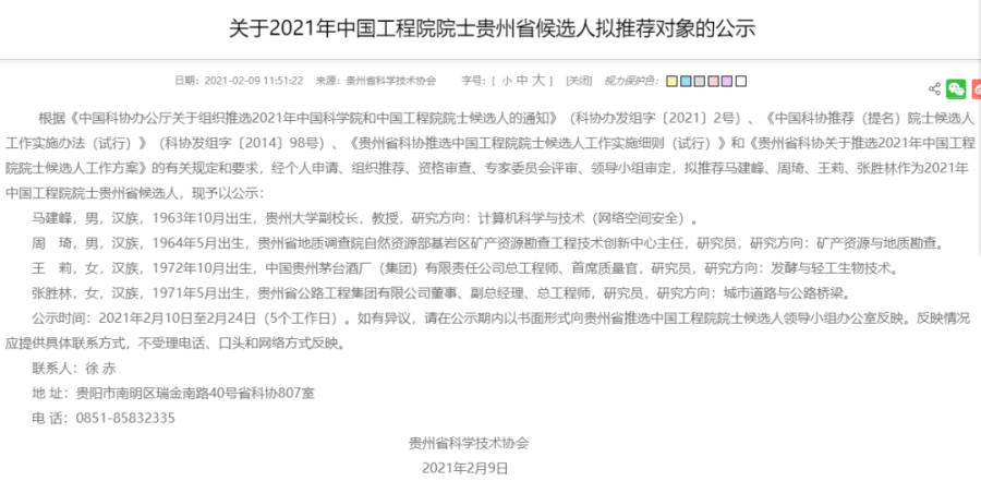 贵州省科协发出的候选人公示,公示时间为2月10日至2月24日。
