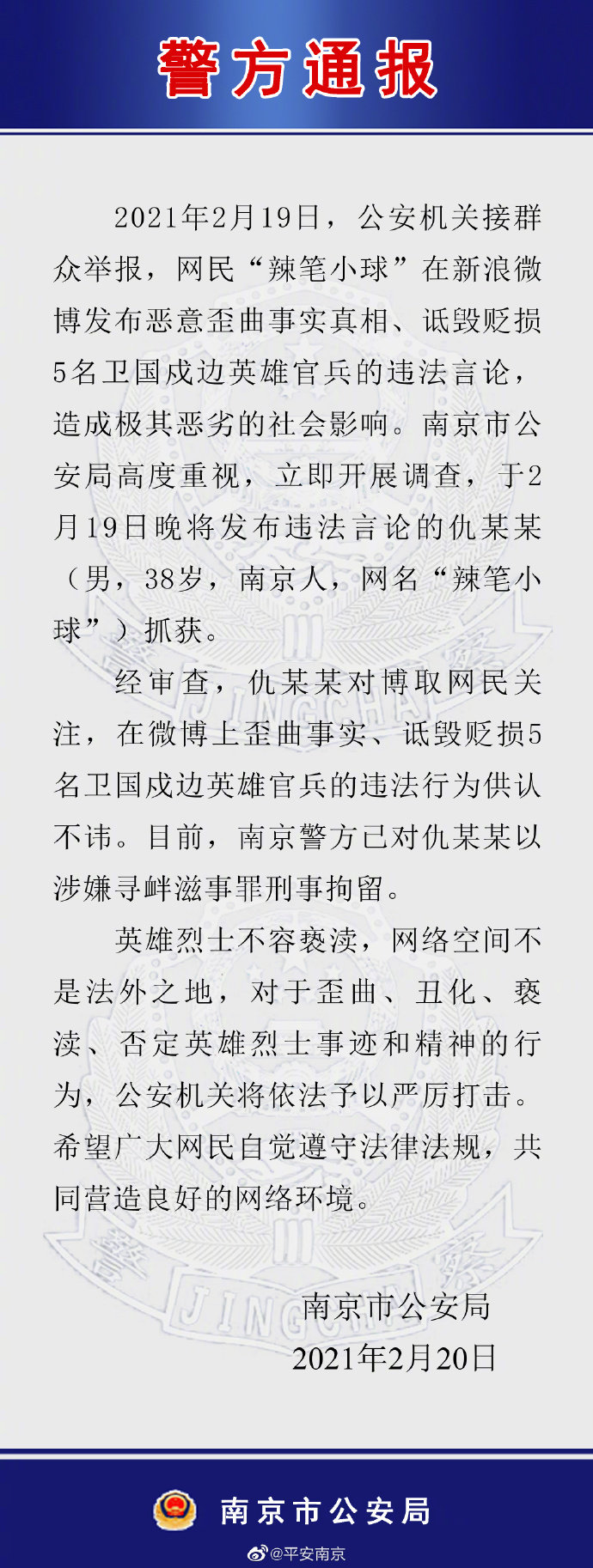 @平安南京2月20日发布通报,网民“辣笔小球”微博发布恶意歪曲事实真相、诋毁贬损5名卫国戍边英雄官兵的违法言论,被刑事拘留。