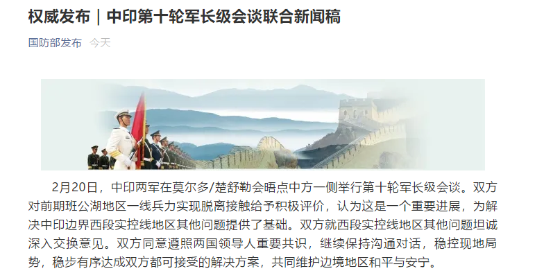 2月20日,中印两军在莫尔多/楚舒勒会晤点中方一侧举行第十轮军长级会谈。双方对前期班公湖地区一线兵力实现脱离接触给予积极评价,认为这是一个重要进展,为解决中印边界西段实控线地区其他问题提供了基础。双方就西段实控线地区其他问题坦诚深入交换意见。双方同意遵照两国领导人重要共识,继续保持沟通对话,稳控现地局势,稳步有序达成双方都可接受的解决方案,共同维护边境地区和平与安宁。