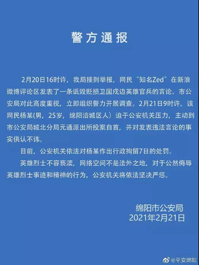 2月20日16时许,我局接到举报,网民“知名Zed" 在新浪微博评论区发表了一条诋毁贬损卫国戍边英雄官兵的言论。市公安局对此高度重视,立即组织警力开展调查。2月21日9时许, 该网民杨某(男,25岁, 绵阳涪城区人)迫于公安机关压力,主动到市公安局城北分局元通派出所投案自首,并对发表违法言论的事实供认不讳。
